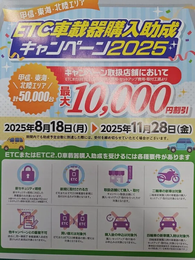 各種要件はありますが、ETCをご検討されている方、ぜひこの機会にお取付ください。