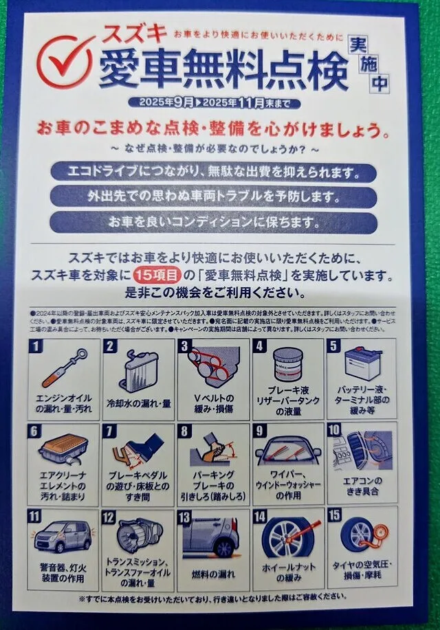 初度登録令和5年以前のスズキ車の方、無料で点検できますよ。
